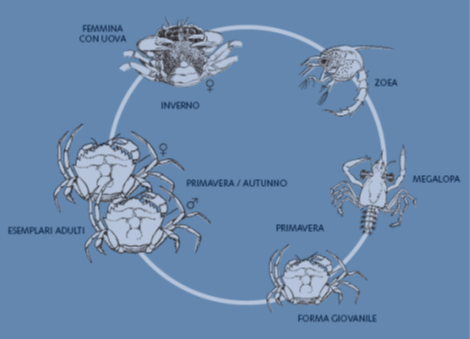 Dall’uovo schiude una prima larva, la zoea, che si trasforma in megalopa, ultimo stadio larvale, la cui muta origina per la