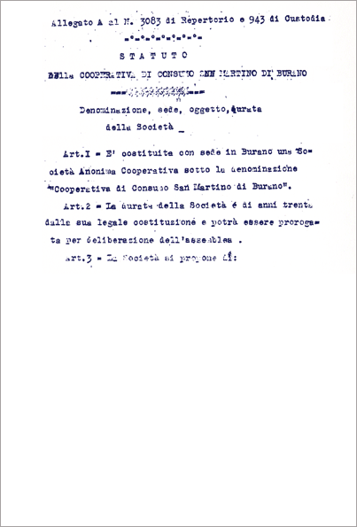 La sera del 03 febbraio 1896 si riunirono in una sala del Municipio di Burano sedici pescatori per costituire la "Famiglia Cooperativa fra pescatori di Burano".