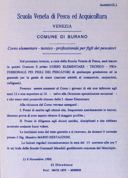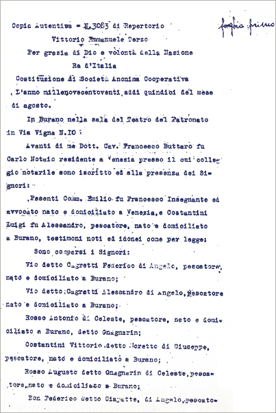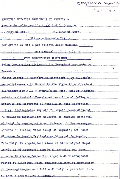 Nasceva in effetti, nell’isola di Burano, la prima Cooperativa di lavoro fra pescatori di mestiere della laguna di Venezia. Erano presenti il Prof. Davide Levi-Morenos,