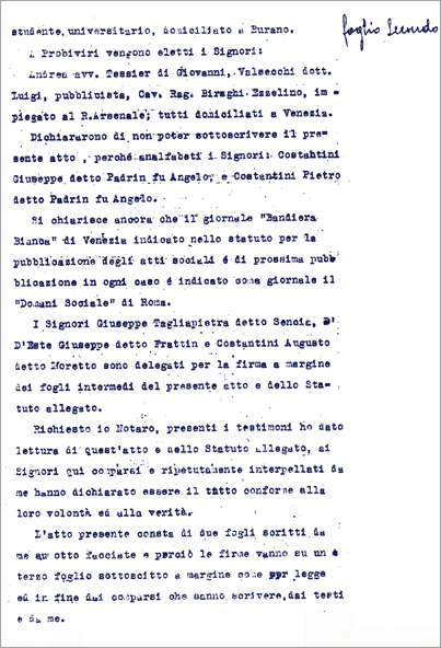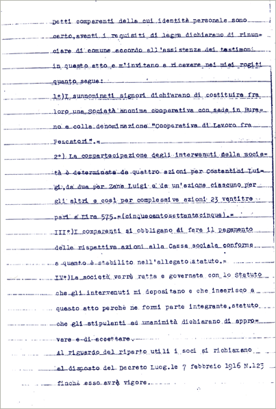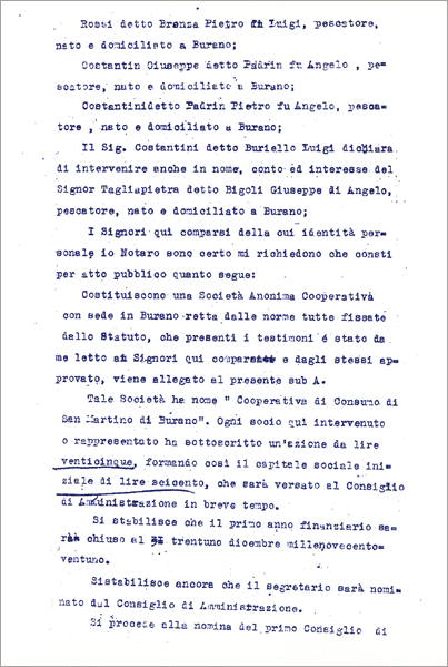 Una cooperativa fra pescatori. Ieri l'altro si radunarono in una aula scolastica circa cento pescatori i quali, dopo un breve discorso del Prof. Levi Morenos, costituirono legalmente per atto del notaio De Toni una Società Cooperativa di Previdenza e Lavoro fra pescatori intitolata: "I Buranelli".