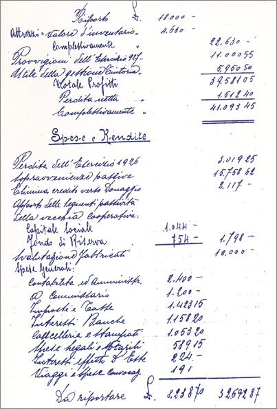 Dal primo bilancio approvato il 21.03.1896, la Cooperativa evidenziava le seguenti entrate e uscite:
