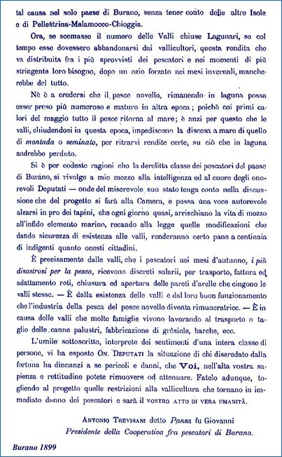 della Società Cooperativa Previdenza e Lavoro fra i Pescatori di Burano, Antonio Trevisan detto Pansa fu Giovanni, chiedeva che il progetto di legge governativo